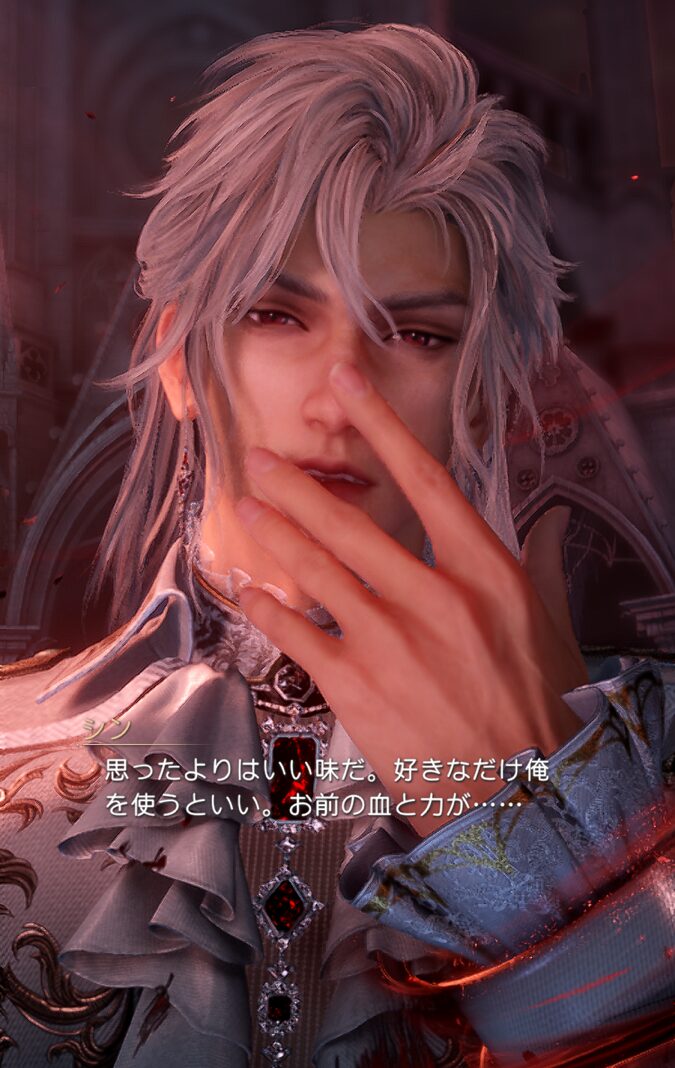 確か前作もタルタロス城の酒場から帰路に就く彼が「竜の呪い」について彼女に語り終えた辺りで同じことを思った記憶があるけども、シンの物語はあるシーンで必ず彼の心模様が彼目線のモノローグでしっかりと表現されるよね。彼があまりに弱みを見せないために発言や行動描写からでは心境を読むことができないからなんだとは思うけど、いわくシンは夢の中で「咲き誇るバラの茂みの中で彼女が死ぬ」場面を目撃し「魂が引き裂かれるような苦痛」と「絶望感」にうなされながら目覚め、思わずそばの彼女に触れ温もりを確かめながらも「お前の血を吸ったせいで俺まで狂ってしまうのか」と思い乱れ、その恐ろしい情景を振り払うように彼女を一晩中腕の中に抱き締めていたらしい。確かに起きたらなぜか後ろからがっちり固められてるなとは思ったが、まさかそんなに切実な想いでいたとはつゆほども思わなかったよ。涙