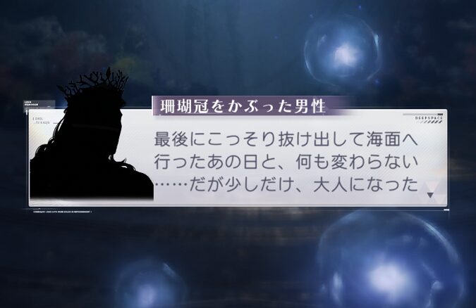 大筋としてまずは伝説「忘却の海」にて「最後の海神」として朝と夜の変わり目の炎の中で生まれたホムラは海神祭でもっとも敬虔な信者を花嫁とするも心臓をえぐり出し契約を終わらせるという方法で海神として完成することができなかった、その後リモリアには「真の終焉」が訪れるけれど彼女が海神を「封印」したことによって滅びるのではなく長い「眠り」につき、数万年を経て再誕した彼女に封印を解かれたことで忘却から「目覚め」た、もっとも海神は彼女を守るためにその命を消費してしまうが最後は彼女が「純粋な信仰」を全て捧げたため「力」を得て生き延びることができた、ここまでが「羅鏡の儚き声」と合わせて明かされている物語であり時系列上「彼女が現世を迎えるまでに必ず辿ってくる過去世」になるのだろう。