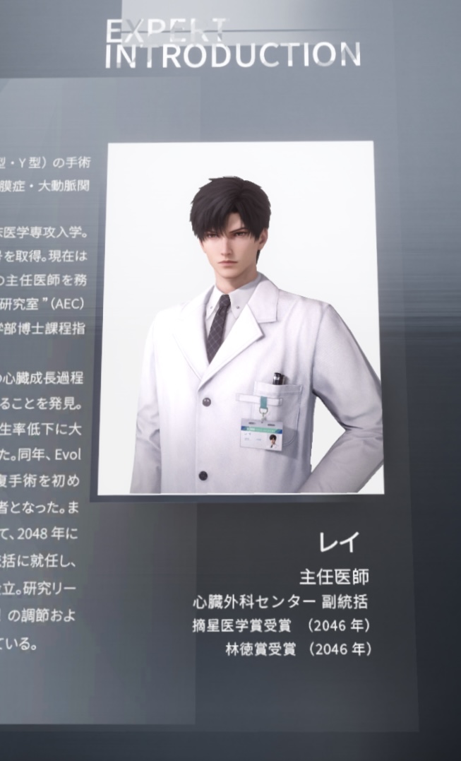 レイの勤め先は「Akso病院」て名前だったのね。肩書は主任医師であり心臓外科センター副統括であり、経歴は2年前に「摘星医学賞」と「杉徳賞」を受賞って書いてあるような。